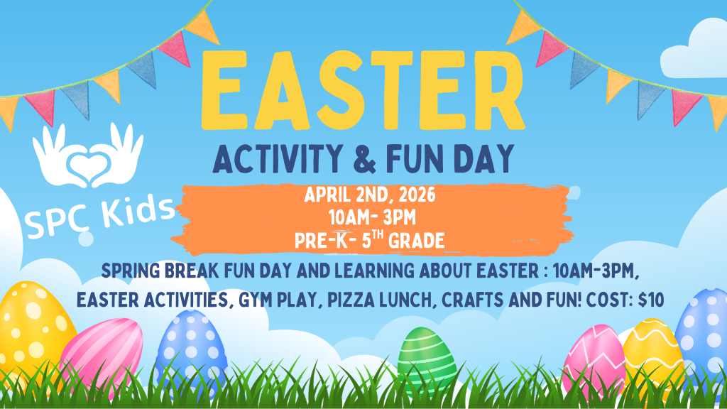 Spring Break Fun Day and Learning about Easter at Church: 10am-3pm, Kid-Friendly Stations of the Cross Activities, gym play, pizza lunch, crafts and fun!